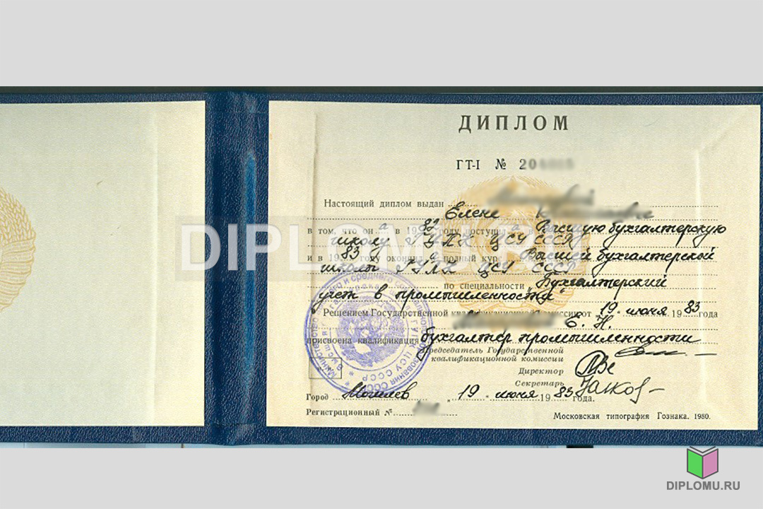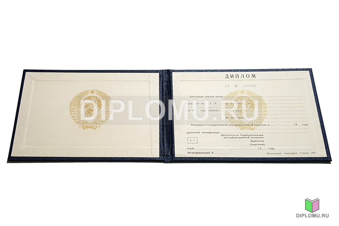 На нашем сайте Вы можете купить диплом техникума СССР (диплом старого образца) с окончанием среднего профессионального учебного заведения в 70-х, 80-х и 90-х годах до 1996 года включительно. До 1991-1993 годов корочки заверялись гербовой печатью СССР (РСФСР), а после данного периода — гербовой печатью России с двуглавым орлом. Наши специалисты заполнят Ваш документ по всем правилам, установленным на тот период. Заверяются «мокрыми» печатями и нужными подписями. Обращайтесь. Работаем быстро, профессионально.